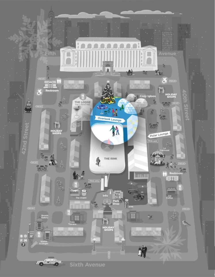 Overlook Lounge is on the top floor of the skating pavilion. Find the entrance across from the Christmas Tree and Cozy Igloos.